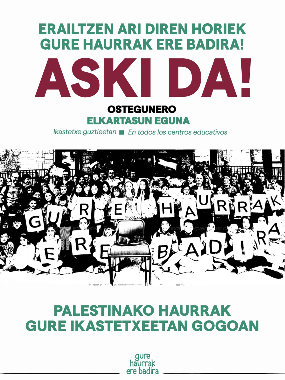 “Gure haurrak ere badira” elkarteak egin duen deialdiarekin bat eginez, urriko lehen hiru ostegunetan (urriak 2, 9, 16) elkarretaratzeak egingo ditugu hiru egoitzetako atarietan. Ikastolako ikasle, langile eta familia guztiei dei egiten dizuegu Palestina pairatzen ari den genozidioa salatzeko kontzentrazioetan parte hartzera. Bertan, argazkiak atera eta elkarteari bidaliko dizkiogu. Hemen ordutegiak: