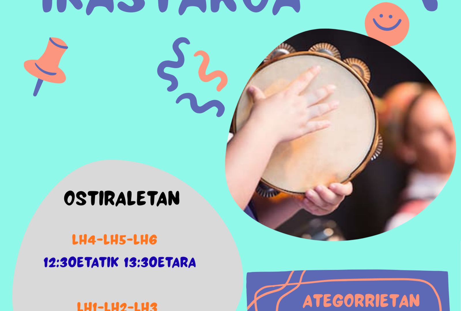 LHko ikasleentzako pandero-ikastaroa antolatu du Zurriola Musika eta Dantza Eskolak otsailetik maiatzera bitartean. Ostiral eguerdietan izango da, Ategorrietan, jangelako txandak errespetatuz. Panderoa Musika Eskolak jarriko du: Panderoa gure kontu, gogoa zure kontu! Eman izena!